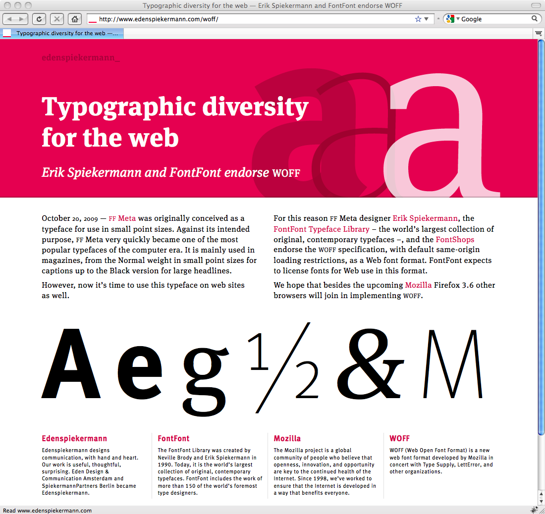 WOFF was developed by Mozilla with the support and participation of prominent type font providers, and has been endorsed by FontFont and typographic legend Erik Spiekermann.