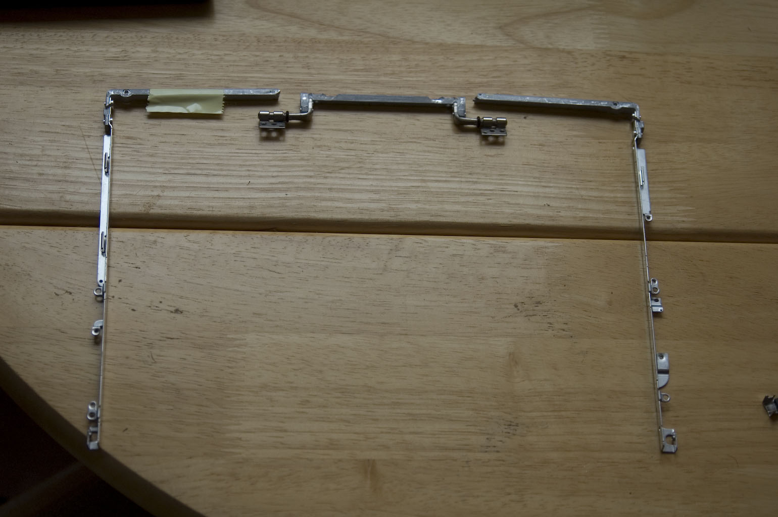 It turns out that the iBook has a hinge and brace that extends up into the screen housing behind the bezel. Mine was in three pieces and needed to be replaced by just one. The hitch was that this piece holds the LCD in place and has wires snaking all around and through it. As it turned out, the other hitch was that the entire case would have to come off of the main section of the laptop in order to replace the hinge. The keyboard had to be removed, as did the hard drive and just about everything else attached to the motherboard.