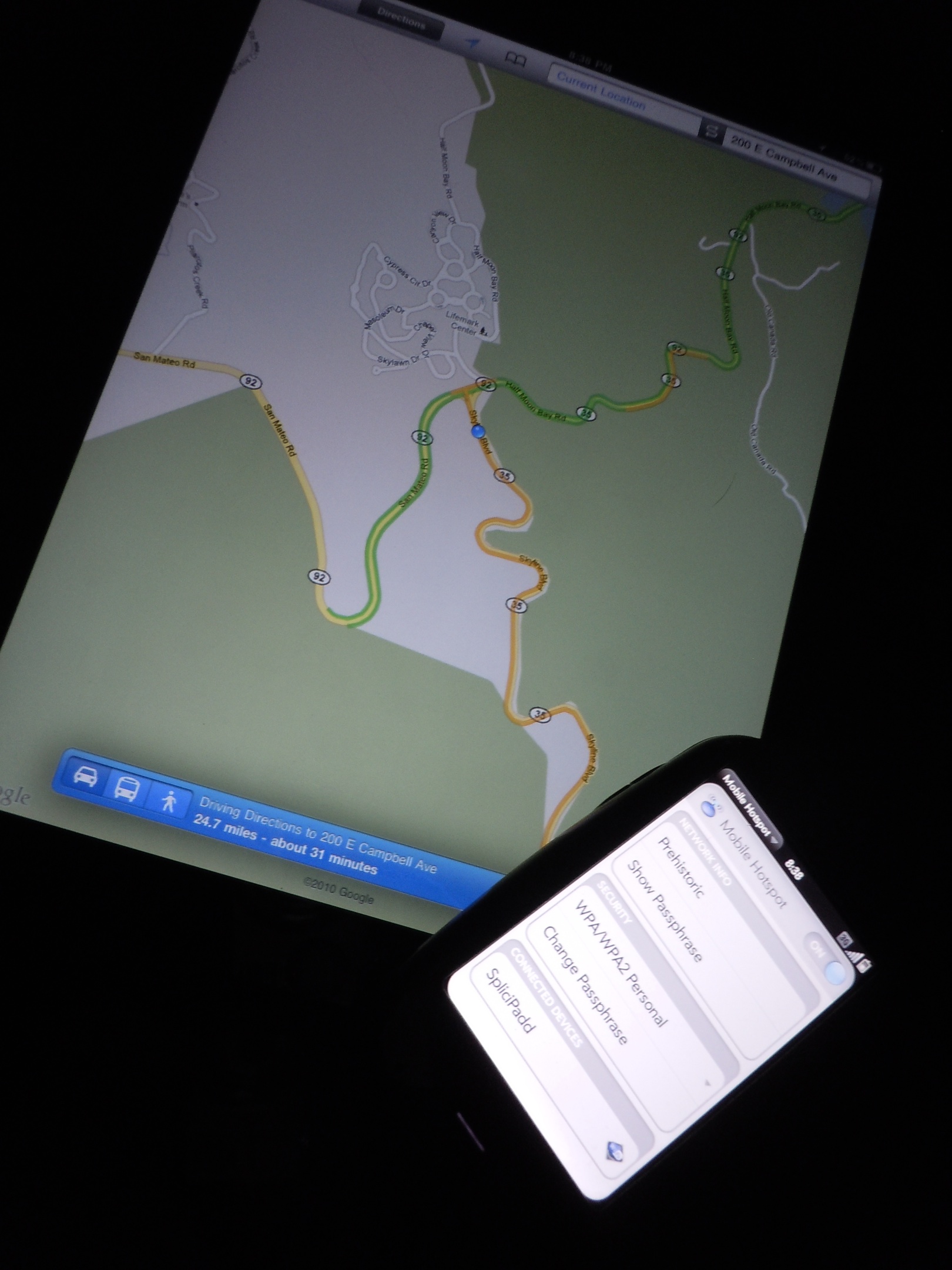 The iPad (remember that this is the first generation iPad with a 3G cellular radio and GPS chipset) despite not having a data plan, tethered to the Pre and pulled up a map based on the location it got from GPS data. Just like that.