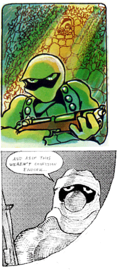 Michael Cherkas’s The Silent Invasion opened my eyes to the value of brush work. I tried doing a whole story only in brush (Rick Trigger: The Cop With His Mouth Full published in the back of The Saga of Elf Face. If you don’t already know, don’t ask. Really.) and discovered how difficult it is. I still have nowhere near the facility with a brush that I should have, but I owe whatever chops I have to attempting to copy Cherkas’s style from Silent Invasion.