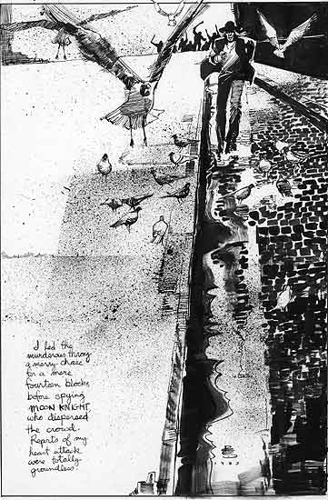 Steve Bissette and John Totleben were doing something like what Sienkiewicz did, except coming from the Joe Kubert camp rather than the Neal Adams camp. These two opened my eyes to possibilities of page and frame layout that broke all the rules and still worked. The lines these two made were incredibly expressive and illustrative at the same time. A few pen strokes and brush strokes and it’s all over. It’s the kind of work that is loose and gestural and spot-on exact at the same time. I still joke that some day I’ll grow up and become Stephen Bissette.
