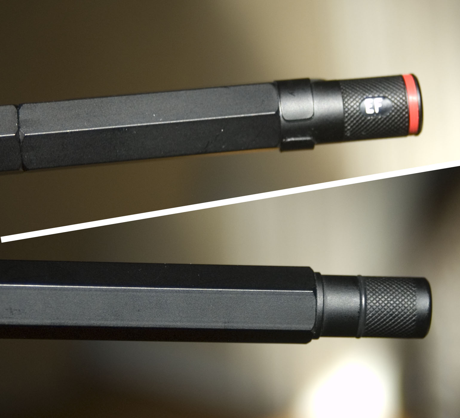 When Rotring began making the 600, its ends had diamond-grid knurling at the first half-inch or so, and the cap sported a window that could be rotated to reveal the indicator of the size of the nib. After the first few years, Rotring switched to a simpler model with smooth ends, and no such turret. The pen’s cap is shorter on the newer style 600s, but uncapped the pens are the same length. Since the cylindrical end of the barrel is shorter on the newer model, the cap rides a bit higher when posted, making the newer model almost 2mm longer with the cap posted, despite being roughly 3mm shorter when capped.