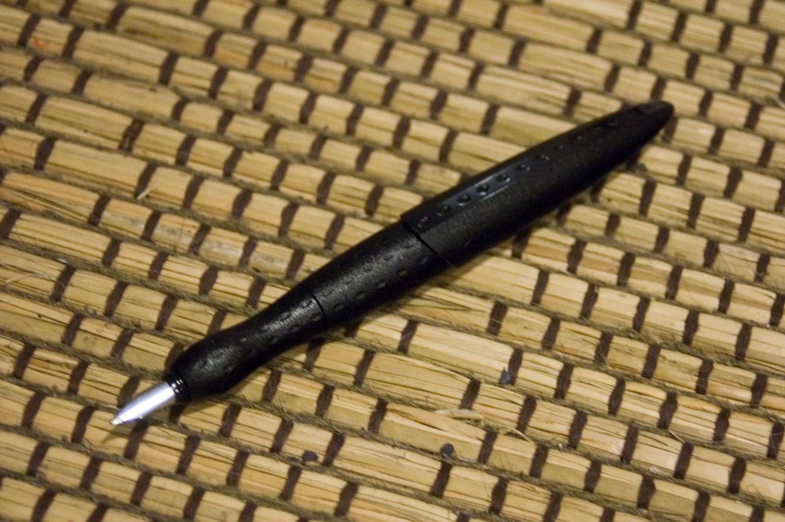 When capped, the Rive looks as though it were a prop from a bad science fiction movie, like some sort of alien seedpod. The entirety of the barrel is covered in dimples at regular intervals that must be there to promote grippiness, except that they don’t do so very effectively. Removing the cap reveals a contoured section designed to mimic the curves of one’s thumb and forefingers, which seems nice, but being made of the same hard plastic as the rest of the pen’s body ends up not being very comfortable at all. A soft-rubber grip in this shape might be more comfortable, but I found the shape itself to be too limiting. When holding a pen my thumb and forefinger usually are not directly opposite one another. With the Rive, they must be, which results in come uncomfortable curling of my forefinger.