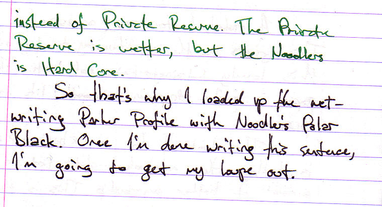 I wrote with the Pilot Knight, Rotring Initial, and Parker Profile, loaded with Private Reserve and Noodler’s inks. Under a 10x loupe I was able to detect a hint of spread in the Noodler’s Polar Black from my Parker Profile. The spreading is really not noticeable to the naked eye.